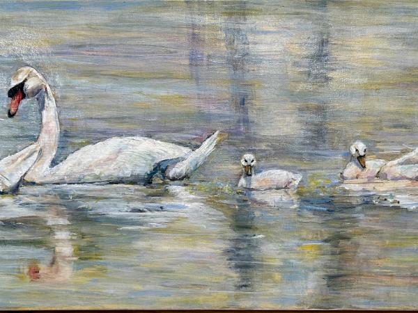 This swans family capture a beautiful moment in time in the afternoon light. The cygnets have their white feathers and will be ready to fly in a few weeks